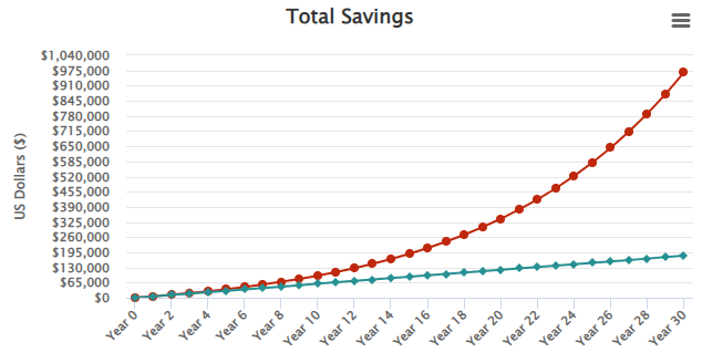 Compare the two charts saving $500 a month with no compounding effect vs the average return of the S&P 500.
